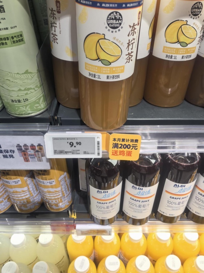 更值得一提的是,奥乐齐的生鲜品类不仅全,还很有特色。除了常见的本地蔬菜、猪肉禽类,还引入了进口牛肉、锡兰红茶基底的冻柠茶、德国风味香肠等差异化商品,既满足了大众家庭的日常需求,也吸引了追求品质的年轻客群。