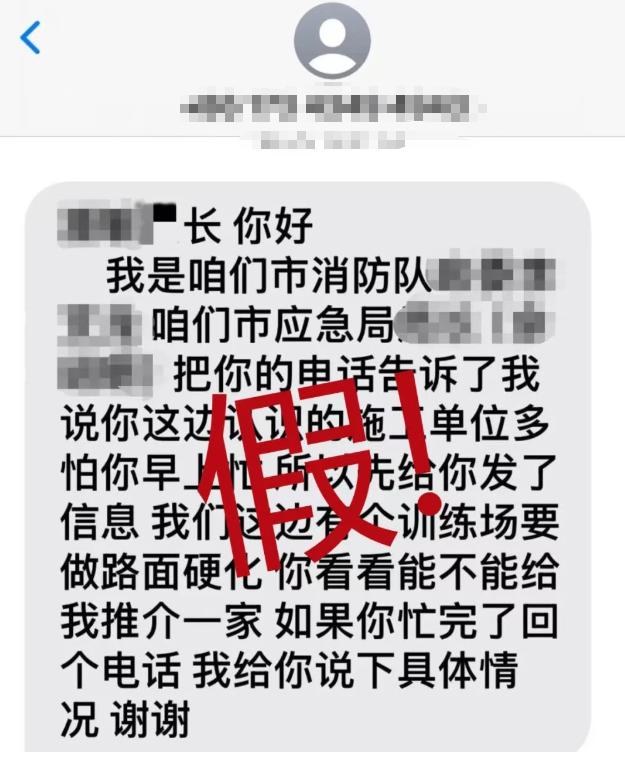 近日,湖北省十堰市消防救援支队接到社会单位反映,有不法分子打着消防工作人员的旗号,群发短信给单位相关公职人员,称消防队有工程,需要帮忙介绍施工方。