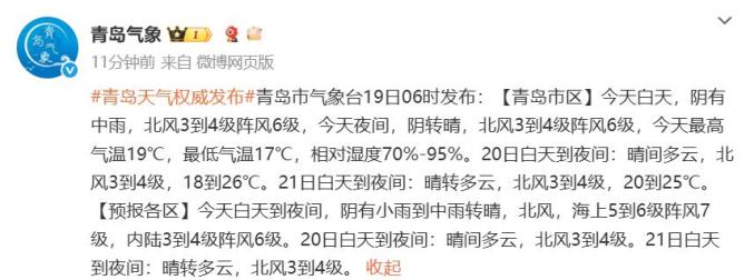 【青岛市区】今天白天,阴有中雨,北风3到4级阵风6级;今天夜间,阴转晴,北风3到4级阵风6级,今天最高气温19℃,最低气温17℃,相对湿度70% - 95%。