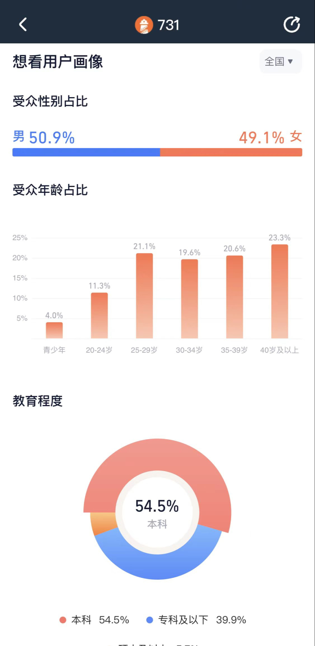 9月18日,电影《731》上映,首日票房超3.4亿,总票房破4亿。在非周末的工作日取得这样的成绩,着实不易。首映当天,《731》排片率超70%,票房收入占全日票房大盘的97%。其中,20 - 39岁的青年观众占比高达72.6%,是主流观影人群。