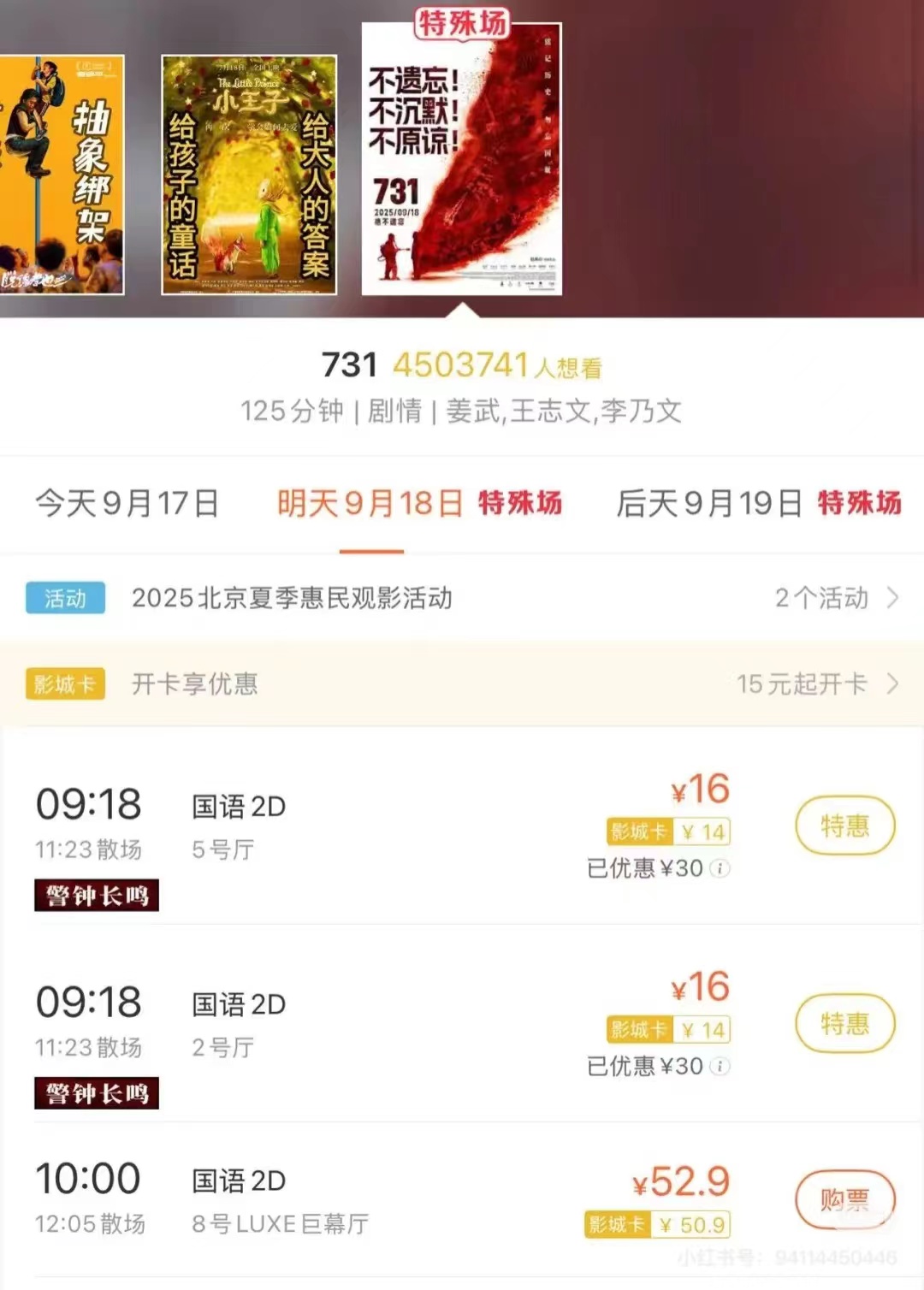 国内多地影院在排片上增添了“仪式感”,许多影院将当日的首场放映时间定在了上午9点18分,并注有“警钟长鸣”的标识,不少观众冲着这个点买票晒出票根,甚至有人专门把座位选在了9排18号。