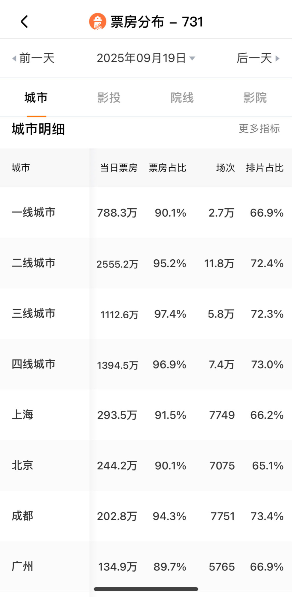 在票房地域分布上,《731》呈现出均衡且广泛的热度。四线城市排片占比最高,达73%,二线城市贡献的票房最多,为2555.2万元。具体到城市,上海以293.5万票房位列城市票房榜首,其次是北京244.2万票房、成都202.8万、广州134.9万。