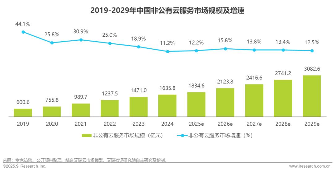 市场概览:2024年中国非公有云服务市场规模1635.8亿元,增速11.2%。