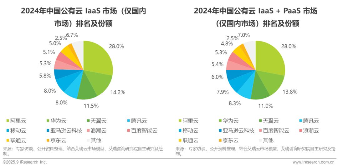 公有云IaaS市场中,阿里云、华为云、天翼云排名前三,腾讯云与移动云并列第四,亚马逊云科技位列第五。