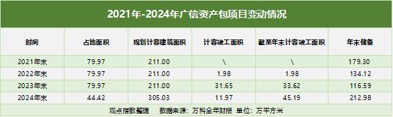 近几年,广州万溪对部分原本低效利用或者闲置的土地进行了整合、置换等操作,因此相较2021年末,广信资产包项目在2024年底的占地面积已减少了44.45%,但同时,规划计容建筑面积提升了44.56%。