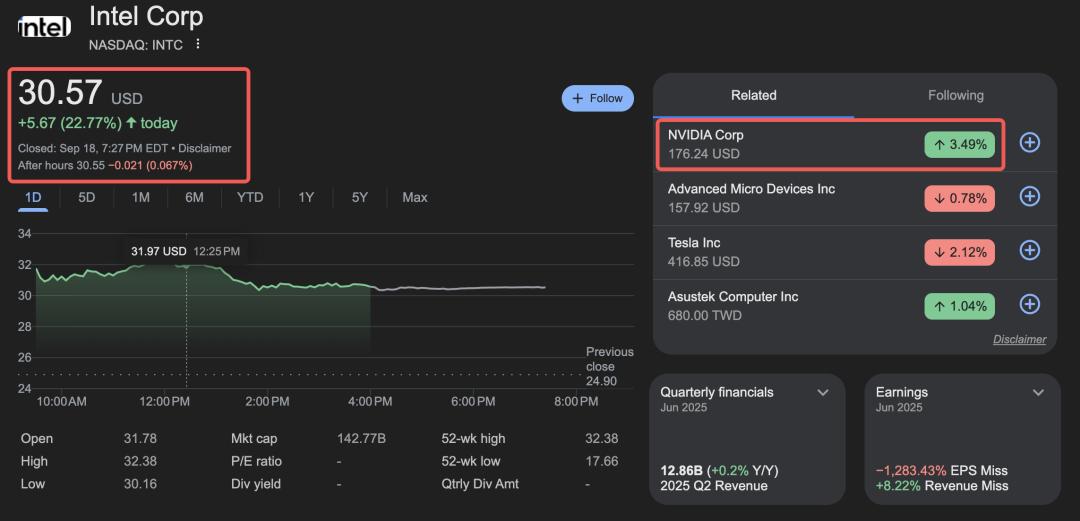 消息一出,原本低迷的英特尔股价瞬间暴涨超20%(英伟达也涨了近3.5%):