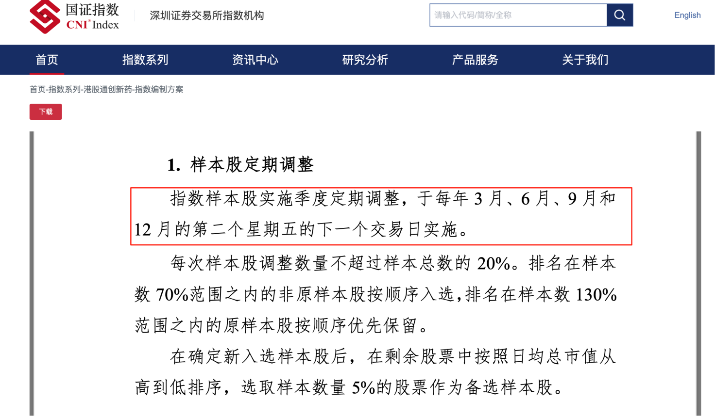 这是由国证指数发布的“港股通创新药指数”,为反映港股通范围内创新药领域上市公司的运行特征。该指数的编制方案显示,成分股每季度调整一次,分别在3月、6月、9月和12月的第二个星期五的下一个交易日执行——正是在9月15日这次定期调整中,药捷安康被新纳入指数。