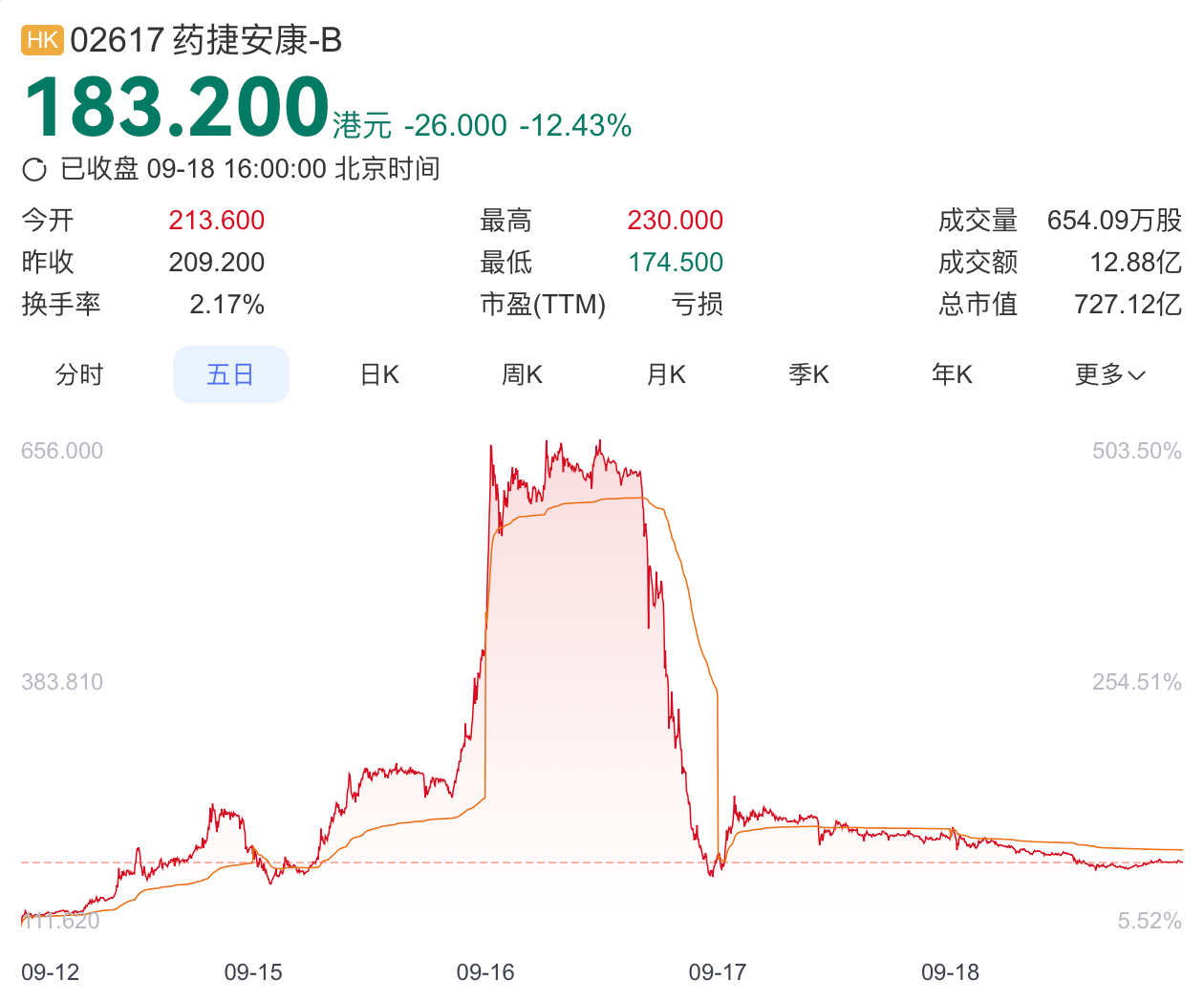 药捷安康,这家上市不足三个月的生物科技公司,在9月16日一度大涨63%,股价冲高到679港元/股,市值逼近2700亿港元巅峰后,午后股价闪崩,下跌54%,市值缩水至762亿港元。