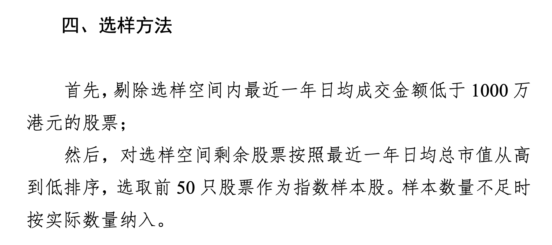 根据“国证港股通创新药指数”的编制方案,样本股的筛选首先需剔除近一年日均成交额低于1000万港元的股票,再将剩余股票按日均总市值从高到低排序,选取前50名作为指数样本。