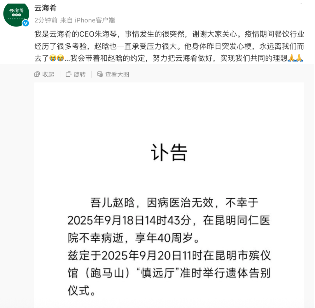 9月19日消息,知名云南菜品牌“云海肴”创始人赵晗,于9月18日因突发心梗,在昆明同仁医院医治无效逝世,年仅40岁。