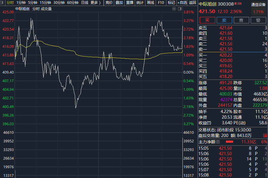 值得关注的是,在尾盘集合竞价时段,部分股票大幅异动。中际旭创从上涨1.49%的位置拉升至上涨2.96%,药明康德从下跌0.53%的位置拉升至上涨1.23%。此外,新易盛、百济神州拉升近1个百分点。