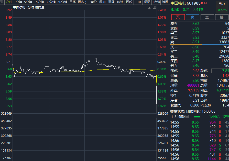 中国核电、中国联通、万华化学等股票则在尾盘集合竞价时段大幅跳水。其中,中国核电的股价跳水近2个百分点,中国联通、万华化学跳水近1个百分点。