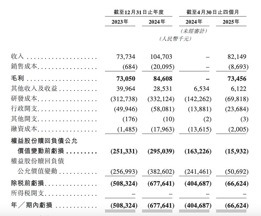 不过,生物医药企业普遍研发周期长、前期投入大,短期内难以盈利。劲方医药在2023年、2024年及2025年前四个月分别实现营业收入0.74亿元、1.05亿元和0.82亿元;同期研发开支分别为3.13亿元、3.32亿元和0.698亿元;净亏损分别为5.08亿元、6.78亿元和0.66亿元。劲方医药表示,开发优质在研药物需长期大量财务资源投资,公司战略核心将继续在该领域持续投资。