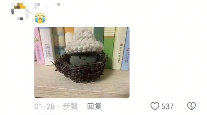 大学生们的脑洞可谓是离谱但合理。这块名为“小石”的石头眉清目秀,还有专属小窝和针织小帽,看来小主人很爱它。