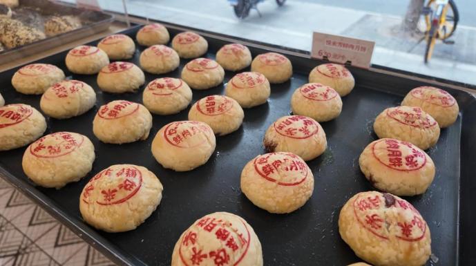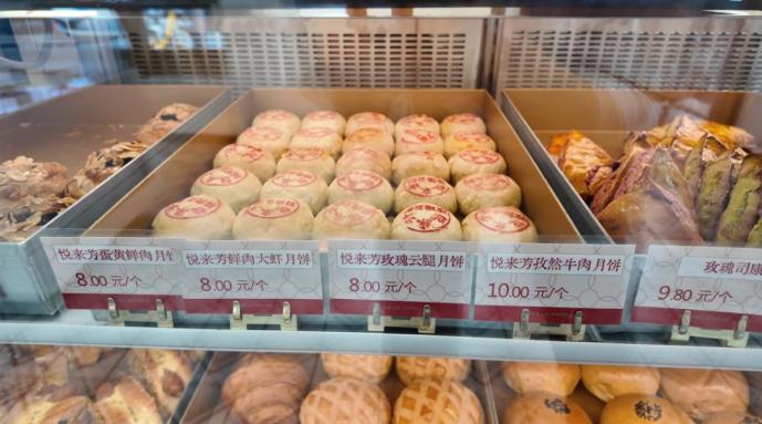 在普陀区老字号悦来芳(兰田店)门口,刚出炉的酥皮月饼香气四溢,吸引众多顾客排队购买。除经典鲜肉月饼外,今年悦来芳还推出鲜肉大虾、孜然牛肉和玫瑰云腿等新口味。其中玫瑰云腿口味采用云南帮扶地区的花瓣和云腿,咸甜交织,深受上海市民喜爱。