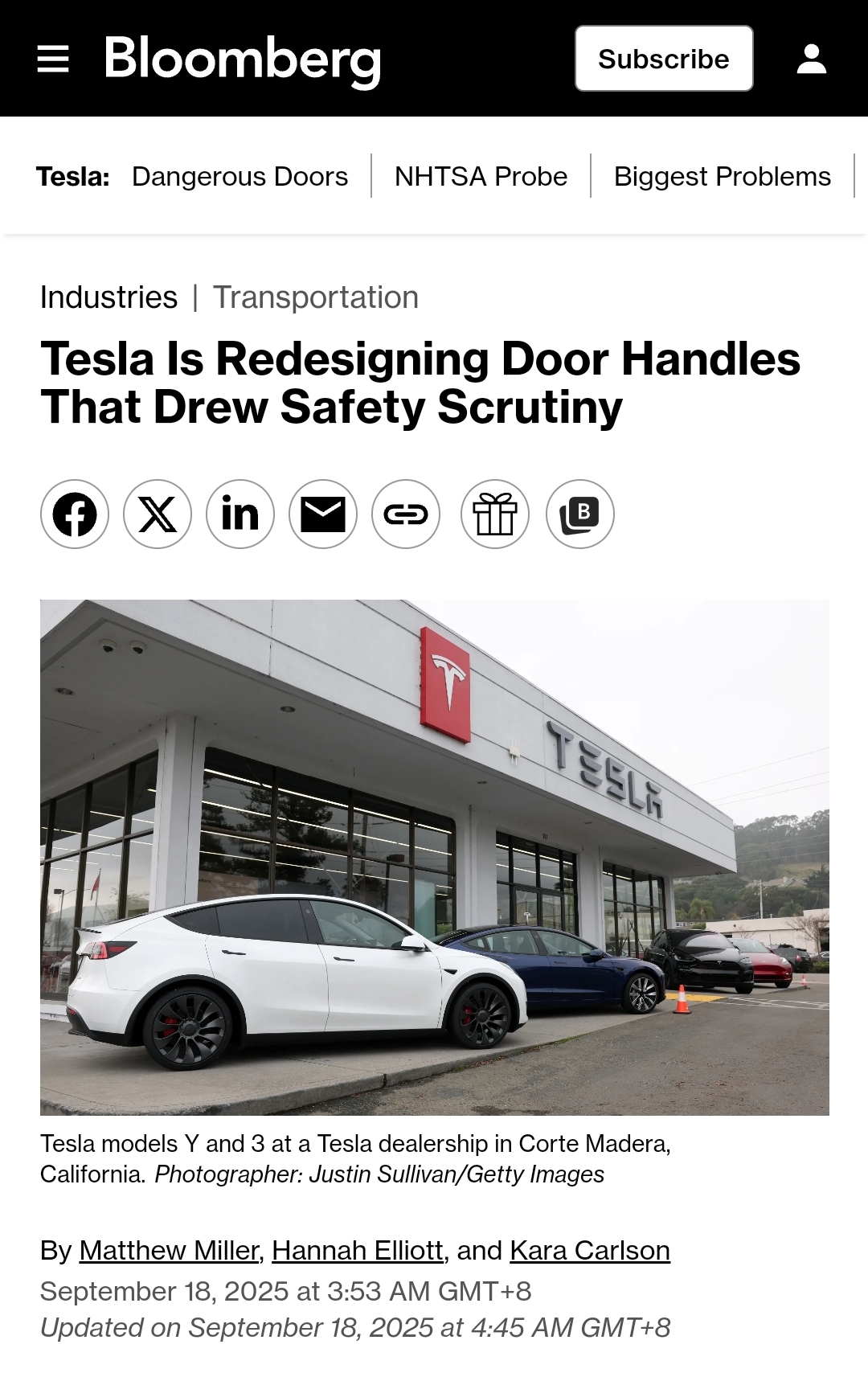 据外媒“bloomberg”报道,特斯拉正在重新设计门把手,原因是部分车主反映电子门把手失灵,导致无法开门,甚至出现孩子被困车内需破窗逃生的情况。