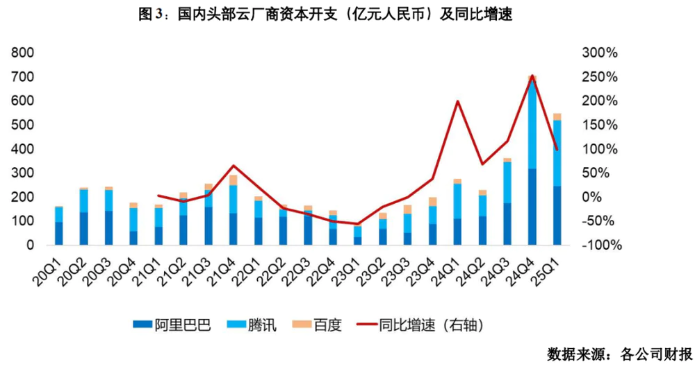 2025年Q1,国内三大互联网厂商(阿里巴巴、腾讯、百度)的合计资本开支为550.12亿元,同比增长99.38%。