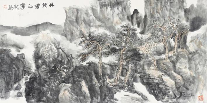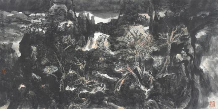 朱敏的艺术创作历程满是探索与创新。他早年学习西画,深入研究表现主义、超现实主义等艺术流派,同时在中国传统绘画领域也打下了坚实基础。他受教于童中焘、陆俨少等多位名师,并对黄宾虹的积墨技法进行深入研究与实践。经过多年思考与探索,朱敏认定中国水墨画的巨大发展潜力,独创了“黑金山水”这一独特艺术风格。在他的画作中,能看到他对自然的深刻理解和对生命的哲学思考。他的山水画并非单纯描绘自然景观,而是借笔墨抒发内心的情感与意境。