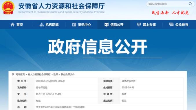9月19日,安徽省人社厅官网发布《关于发布2025年社会保险缴费基数上下限的通知》,明确我省2025年社会保险个人缴费基数上限为21556元/月,下限为4311元/月。
