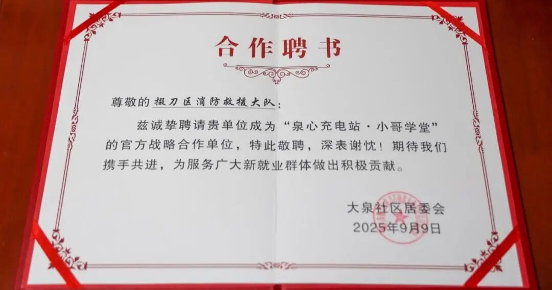 9月9日,“泉心充电站·小哥学堂”开班仪式于掇刀区大泉社区正式开启。掇刀区消防救援大队出席此次仪式,并接受聘书,成为学堂专业讲师团队的一员。活动现场,社区工作人员为掇刀区消防救援大队代表颁发了聘书。