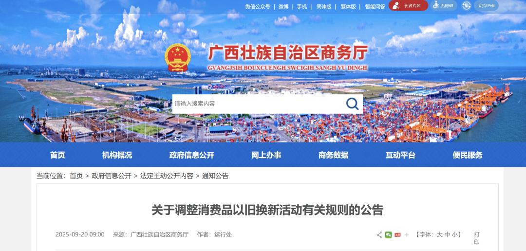 9月20日,自治区商务厅发布《关于调整消费品以旧换新活动有关规则的公告》。