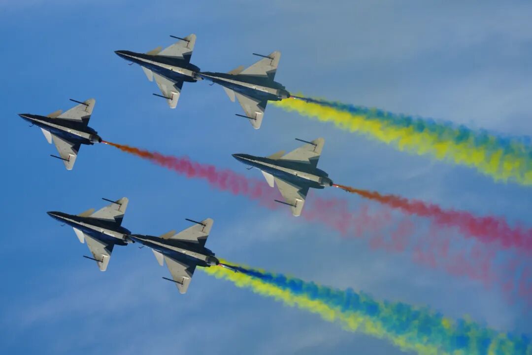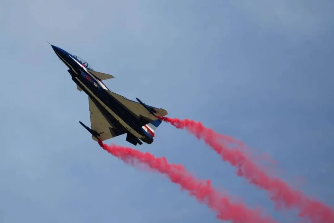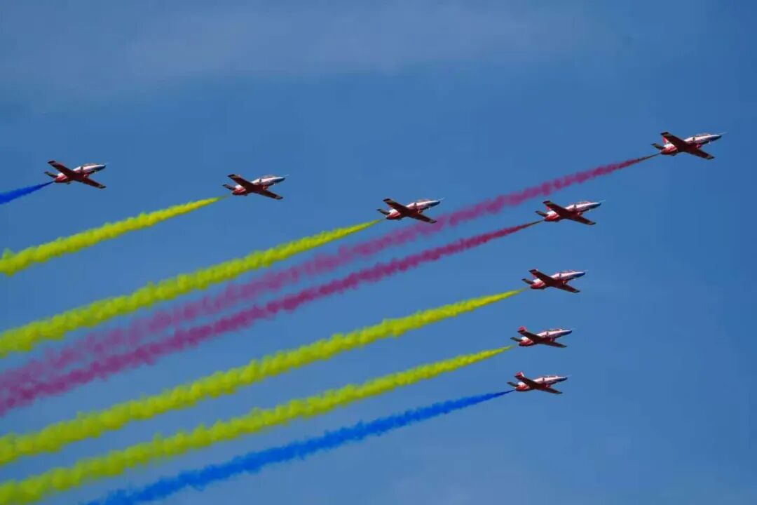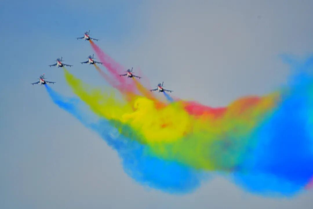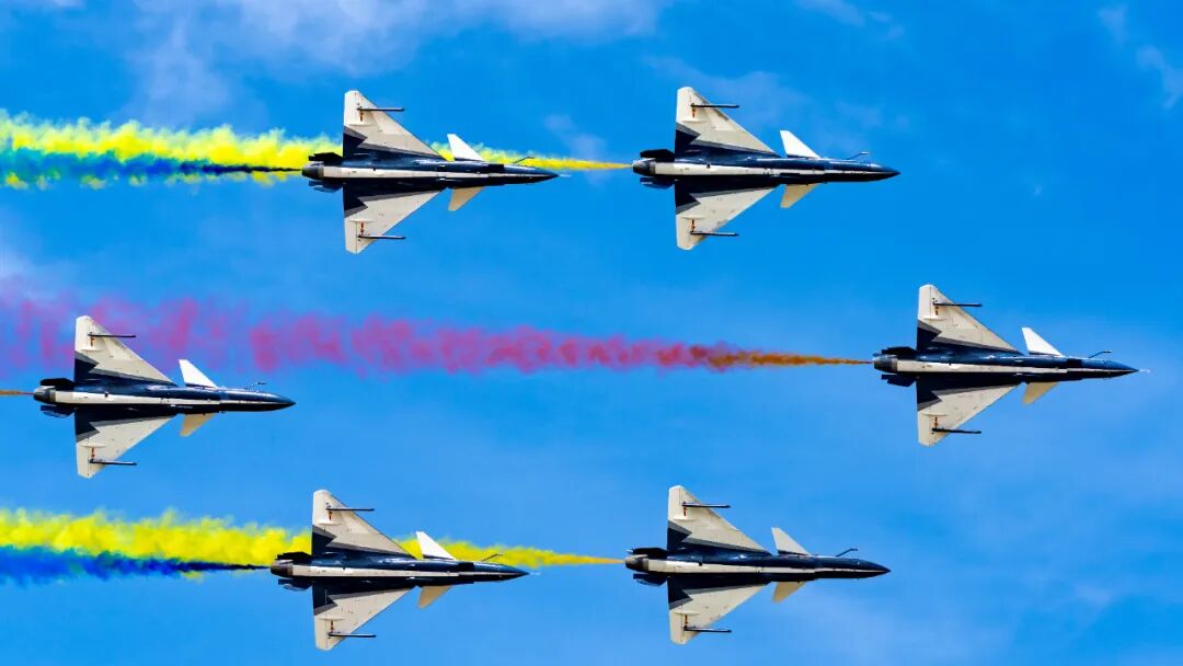 活动中,人民空军多型主力战机翱翔苍穹,多支飞行表演队在蓝天中尽情舞动。