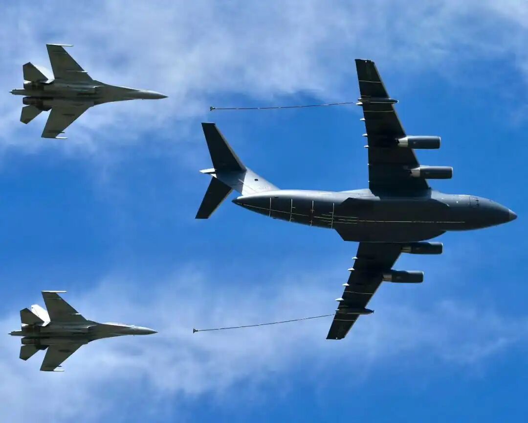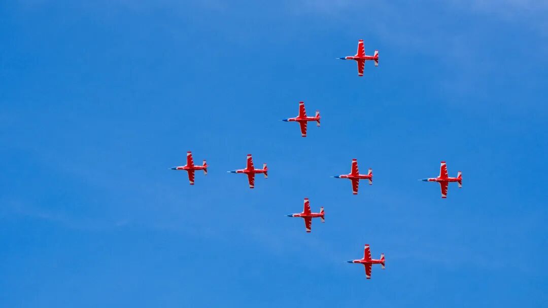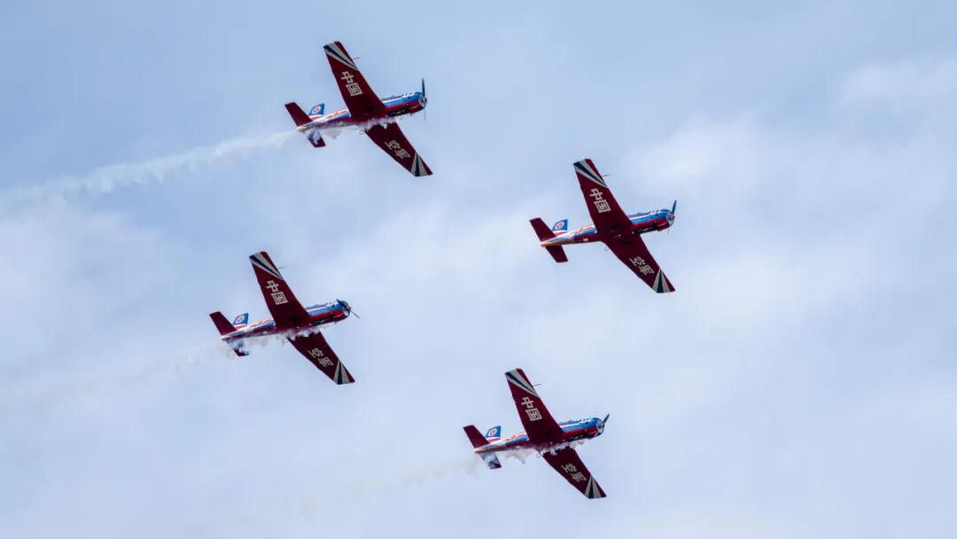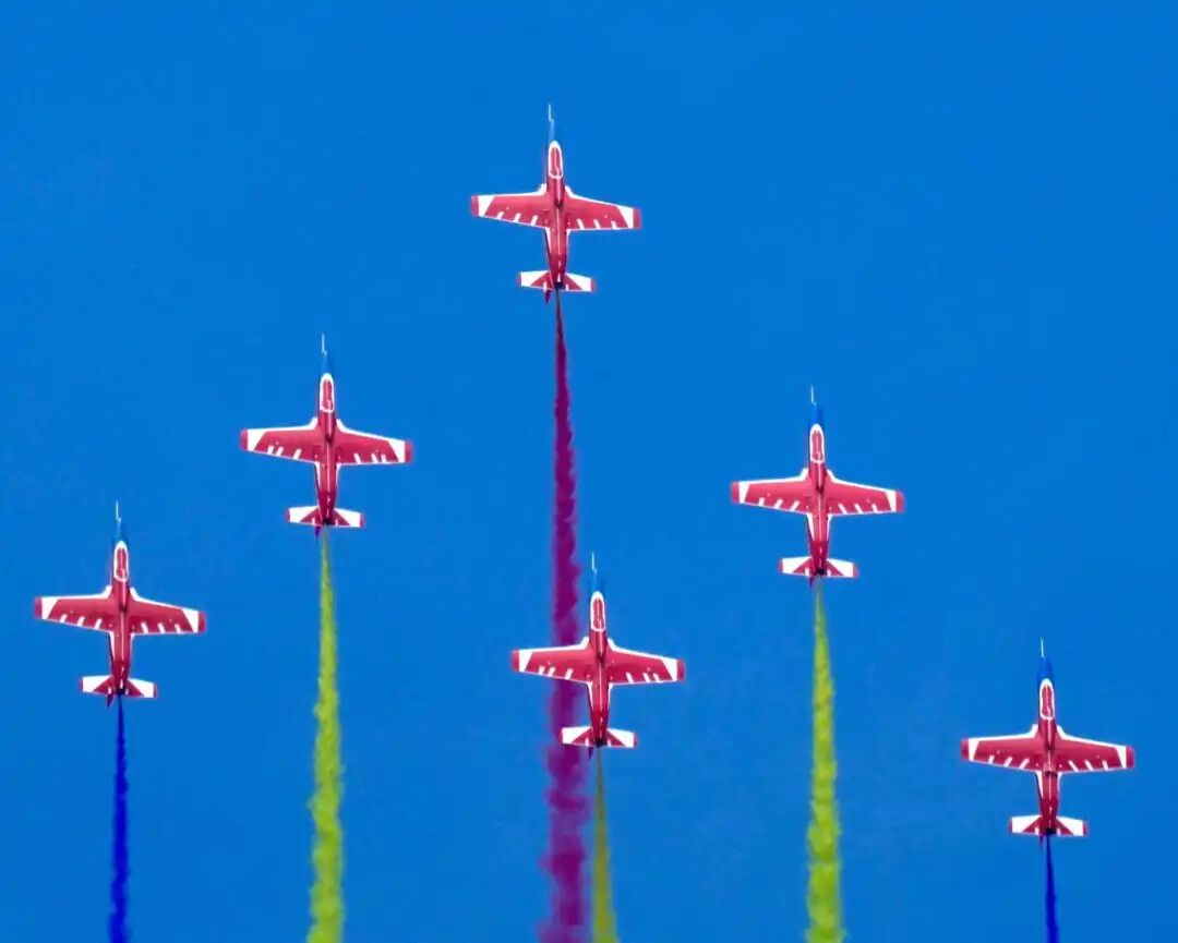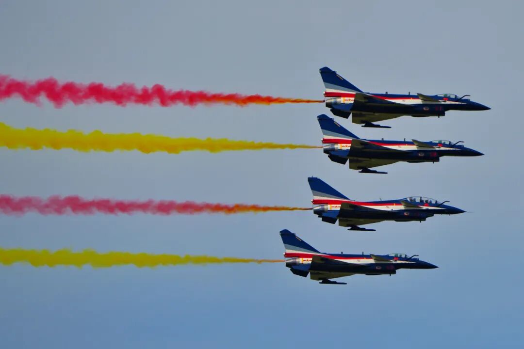活动中,人民空军多型主力战机翱翔苍穹,多支飞行表演队在蓝天中尽情舞动。