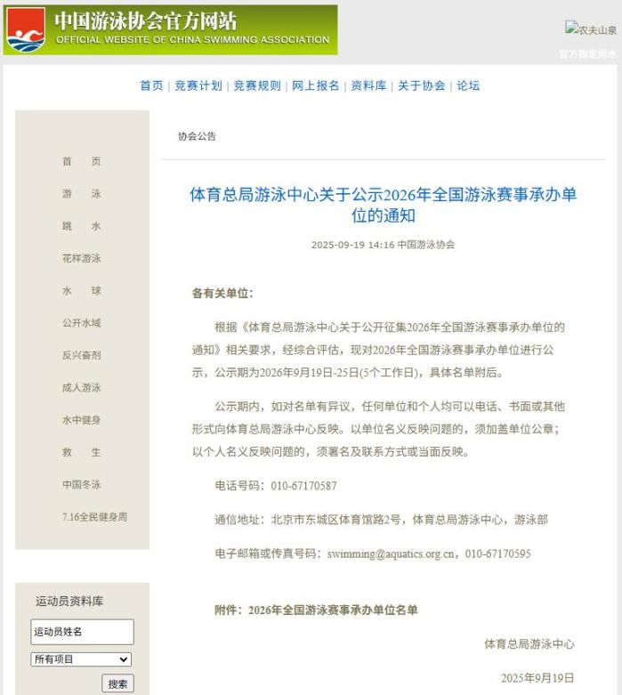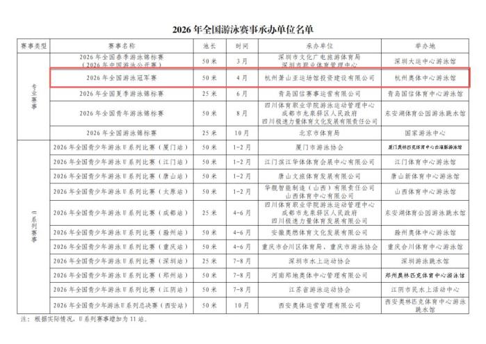 具体名单显示,2026年全国游泳冠军赛计划于明年4月在杭州奥体中心游泳馆举办。