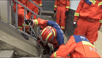 指挥员立即下达作战命令,要求保护好小男孩的脸部。随后,救援人员使用手动破拆工具组对下水道的盖板进行破拆,逐步扩大救援空间。
