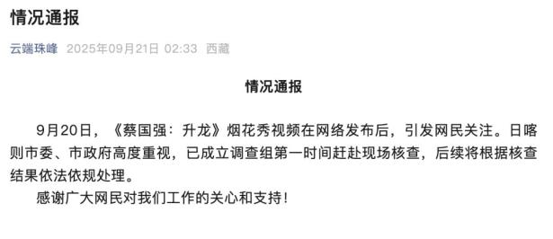 9月20日,《蔡国强:升龙》烟花秀视频在网络上发布后,迅速引起了网民的关注。日喀则市委、市政府对此高度重视,立刻成立了调查组第一时间赶赴现场进行核查,后续将根据核查结果依法依规处理。