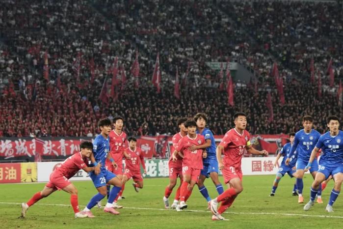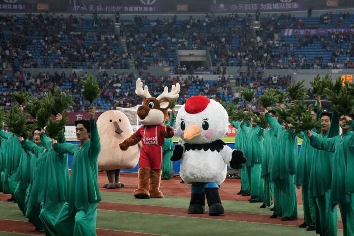 湿地之都的吉祥三宝——麋鹿哥、勺嘴鹬、丹顶鹤,与西溪的老槐树、曹员外等人一边嬉闹一边跟球迷互动。此起彼伏的“鹿王必胜!连云港加油!”混着欢呼与掌声,成了绿茵场上最多彩的BGM。
