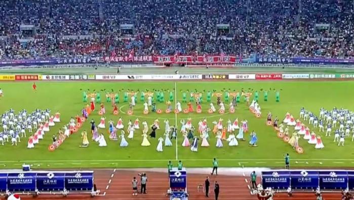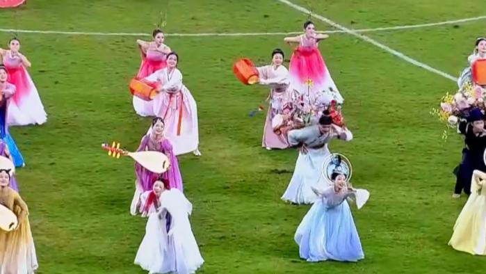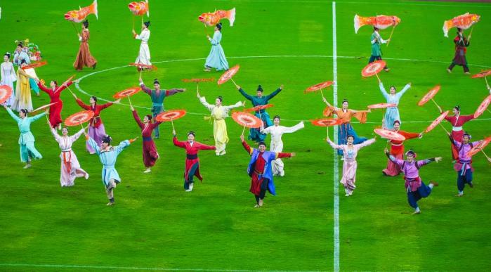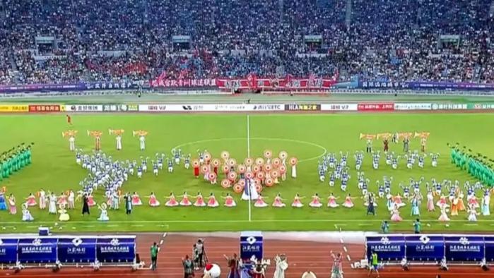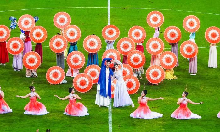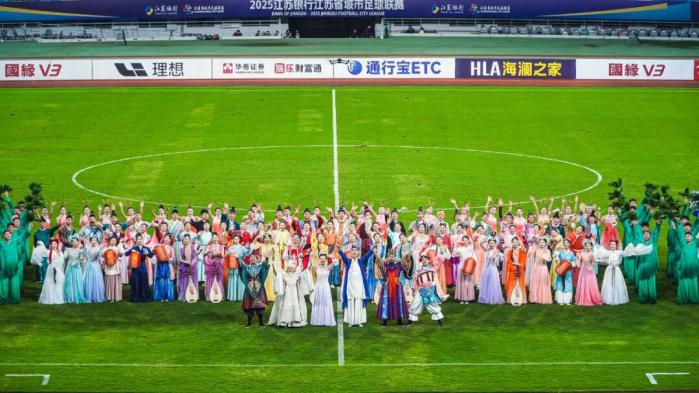 西溪天仙缘艺术团的演员们与来自社会各界的人士,共同谱写出这一曲令人难忘的“苏超”乐章。浪漫与激情交织,瞬间让整个球场充满了湿地之都的独特魅力。