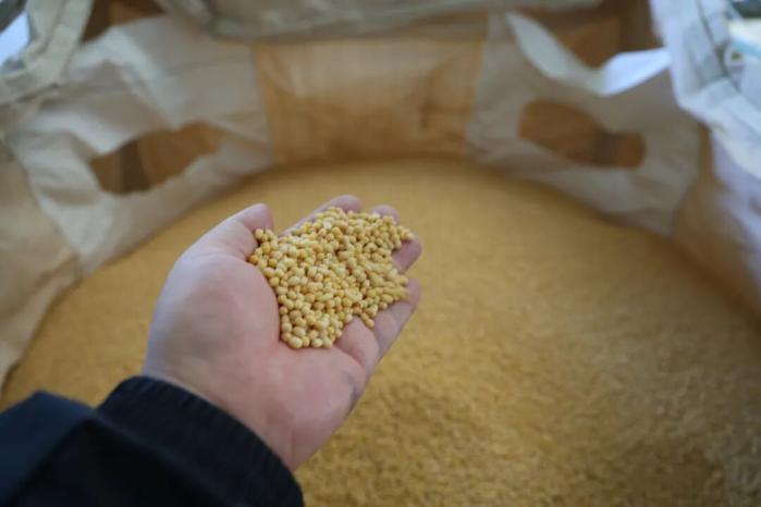 丰收的喜悦不仅在田间弥漫,还延伸到了加工车间。走进突泉县金辉粮贸有限公司的生产车间,一颗颗晶莹饱满的绿豆米从新生产线的机器中滚落出来,工人们正忙着把新鲜加工好的豆米进行包装发货。