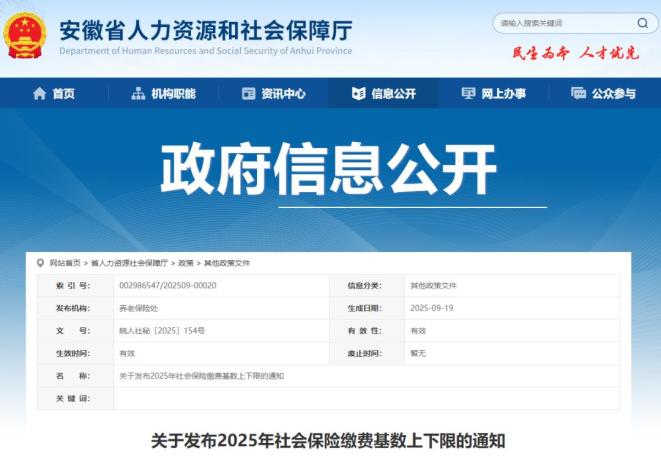 9月19日,安徽省人力资源和社会保障厅、安徽省财政厅、国家税务总局安徽省税务局、安徽省统计局、安徽省医疗保障局联合发布通知,明确安徽2025年社会保险个人缴费基数上限为21556元/月,下限为4311元/月,执行时间为2025年1月1日至12月31日。
