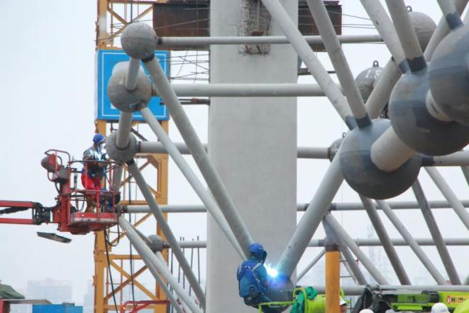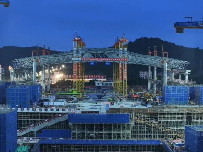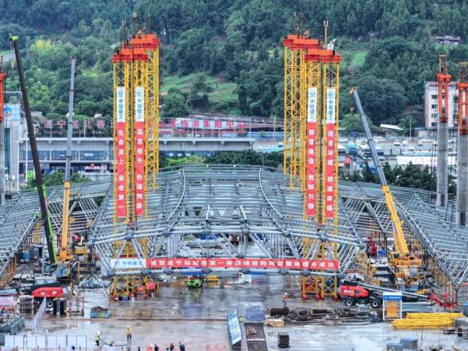 遂宁站北站房屋盖钢结构长81米,宽82米,重800吨,为异型正放四角锥焊接球网架结构。因屋面钢网架采用焊接球节点焊接,工作量大、结构杆件多、安装要求高。为保证施工质量、减少安全风险,项目团队联合业内专家反复论证和优化提升方案,最终采用分段“楼面整体拼装+液压累积提升+高空局部对接”施工方案。该方案用多台高精度液压顶升设备,通过智能化控制系统实现千斤顶同步提升,保障了钢网架提升的稳定性和精确性。在项目与施工团队努力下,高效完成295个焊接球、1063根杆件的拼装及2126条焊缝的焊接作业,历时8小时吊装,钢结构屋面精准就位。