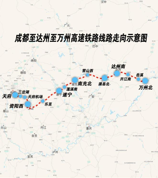 成达万高铁是我国“八纵八横”高铁网沿江通道重要部分,正线全长477公里,设计时速350公里。线路起于四川省成都市天府站,途经四川省资阳市、遂宁市、南充市、达州市及重庆市开州区、万州区,最终接入既有郑渝高铁万州北站。全线新建乐至站、蓬溪南站、营山西站、渠县北站、达州南站、开江南站、岳溪站7座车站。