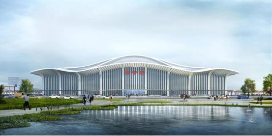 站房设计融入遂宁宋瓷文化元素,提取荷叶盖罐造型意象,轻盈上扬的屋盖好似蝴蝶翅膀,形成“碧水清荷,化茧成蝶”概念,寓意遂宁站华丽蜕变。
