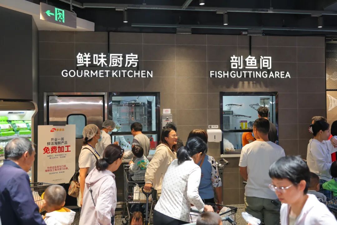 水产区的商品组合丰富多样,帝王蟹、板蟹、波士顿龙虾、珍宝蟹、黑虎虾、石斑鱼、花蟹、花螺、鲍鱼、生蚝、花甲等中高低档水产品应有尽有。新增的鲜味厨房,加工全程透明可视,消费者可以现场挑选、现场加工,口味多样,而且开业前一周海鲜免费加工。