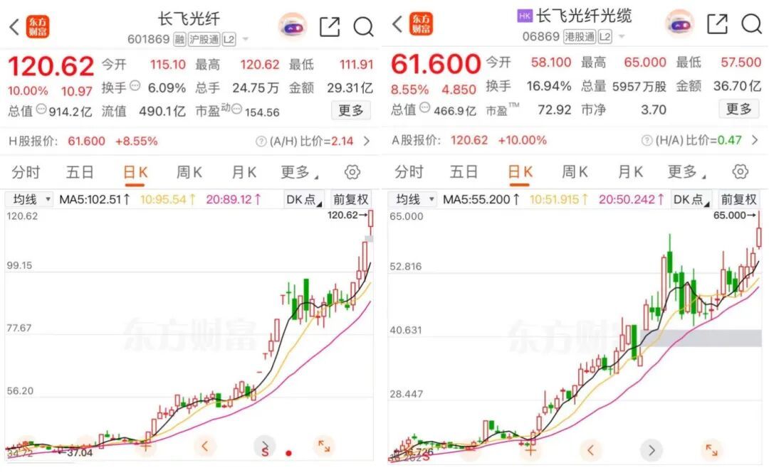 在二级市场上,长飞光纤是一只大牛股。自年初以来,公司A股股价涨幅超过300%,H股股价涨幅更是超过400%。