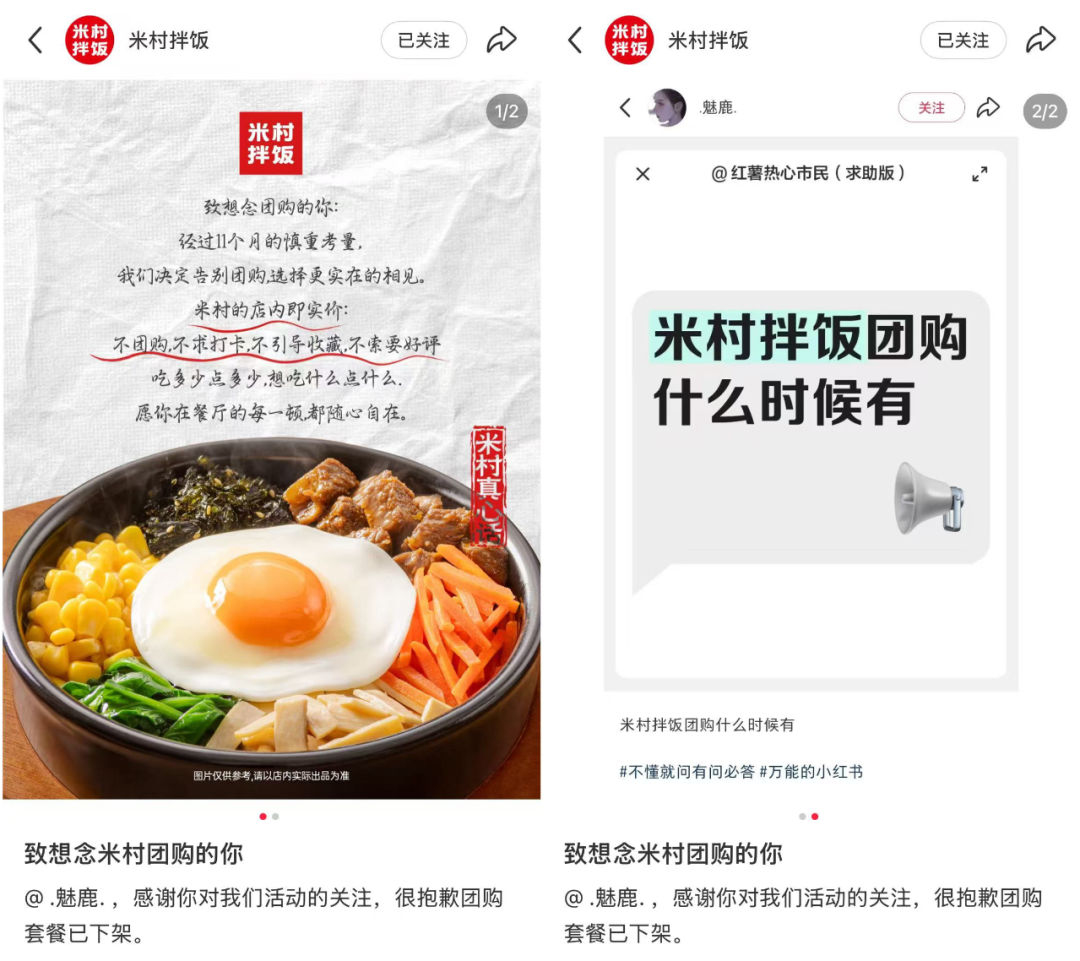 如果说很久以前拒团购是断臂求生,米村拌饭的决定则是深思熟虑后的主动选择。近日,米村拌饭在社交平台声明“致想念米村团购的你”,称经过11个月考量,决定告别团购,选择更实在的相见。同时明确,门店不团购、不求打卡、不引导收藏、不索要好评,让顾客随心点餐。