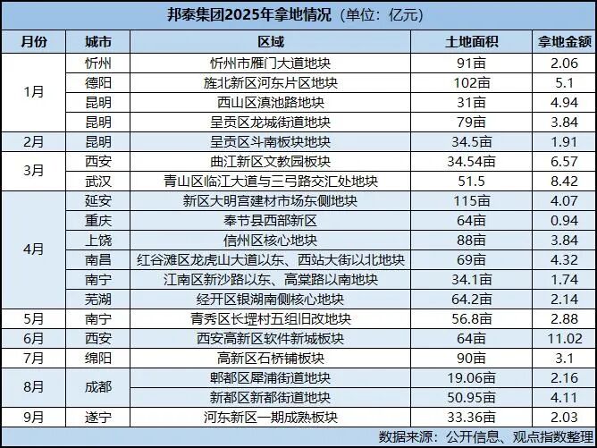 不过,邦泰今年的拿地高峰主要集中在1 - 4月,拿地13宗,5月至今仅在南宁、西安、绵阳、成都及遂宁零星拿下6宗地块。