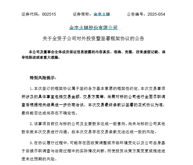 金字火腿在公告中提醒,公司管理层在相关行业技术积累、经验、管理能力等方面有局限,过往有对外投资不成功情况(如2016年购买股权及增资取得中钰资本管理(北京)有限公司51%股权、2023年增资取得浙江银盾云科技有限公司12.2807%股权等),此次跨界投资仍有业绩不达预期风险。