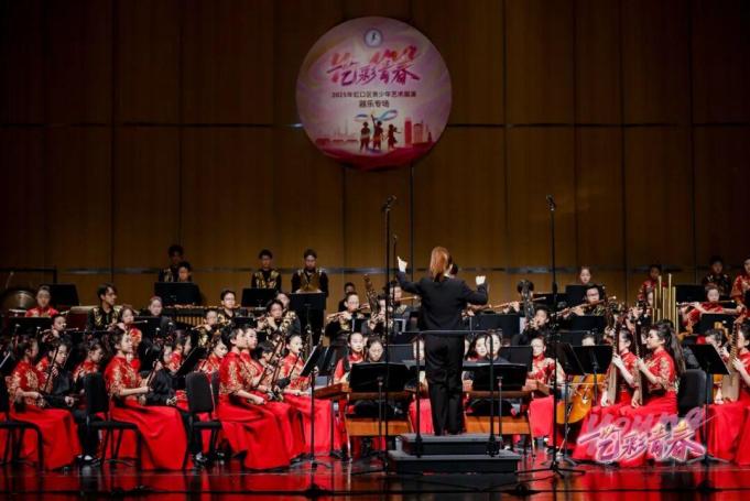 民族管弦乐合奏《再唱山歌给党听》、民族室内乐《望岳》、管乐合奏《草原英雄小姐妹》、铜管重奏《钢铁洪流进行曲》……当晚,虹口区青少年活动中心民乐团、管乐团携手曲阳第四小学民乐团、上海民办丽英小学管乐团,近300人共同奏响艺术强音。从民族管弦乐的宏大深邃,到管乐的激昂澎湃;从大合奏的磅礴气势,到协奏曲的深情对话,少年们用指尖音符书写青春答卷,每一乐章都是虹口美育浸润的成果。