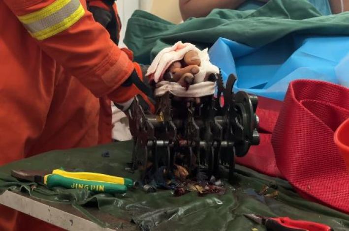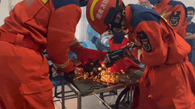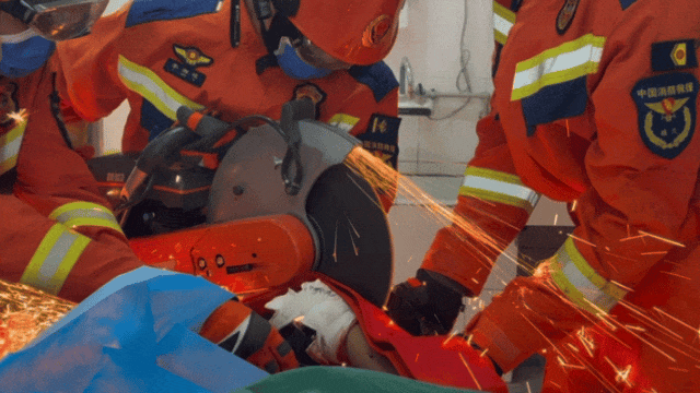 随后,消防员先手动固定滚轴,再用无齿锯对滚轴进行切割,同时采用物理方式降温。由于救援空间狭小,消防员又利用打磨机对“打草机”滚轴进行拆卸和切割,以扩大救援空间。