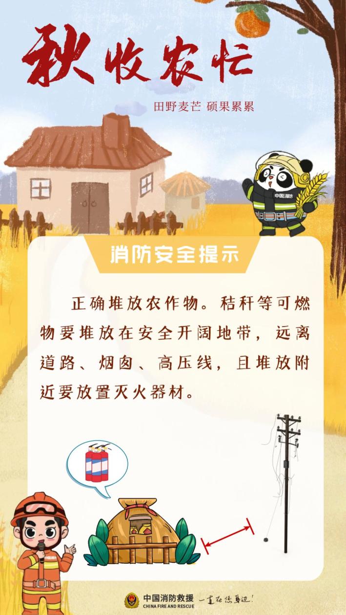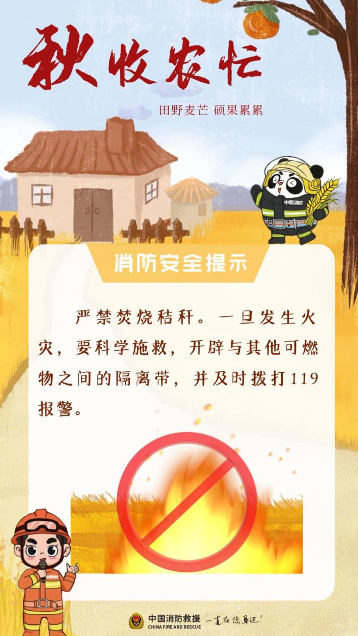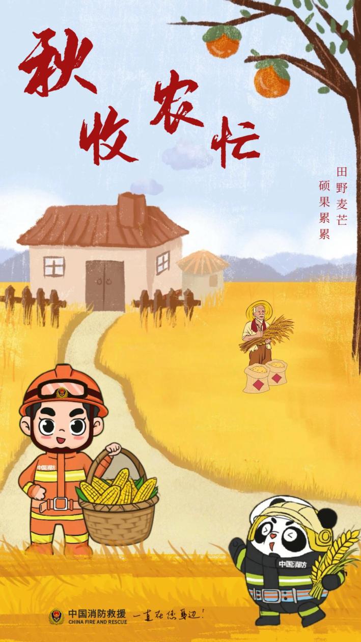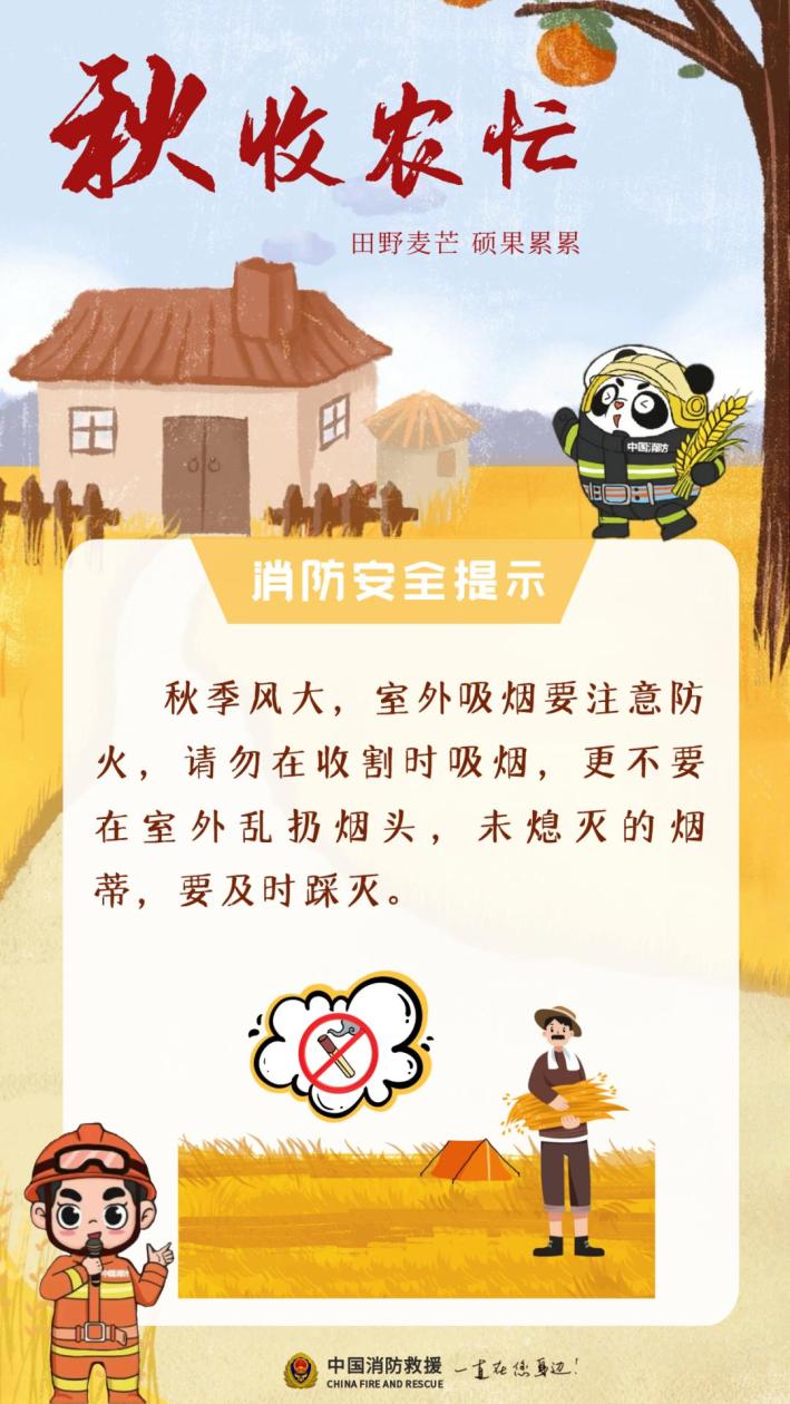 阿消提示,昼夜转换,凉意渐浓,金秋丰收季节已经来临。消防安全是确保丰收成果的重要保障,以下消防安全提示要牢记。