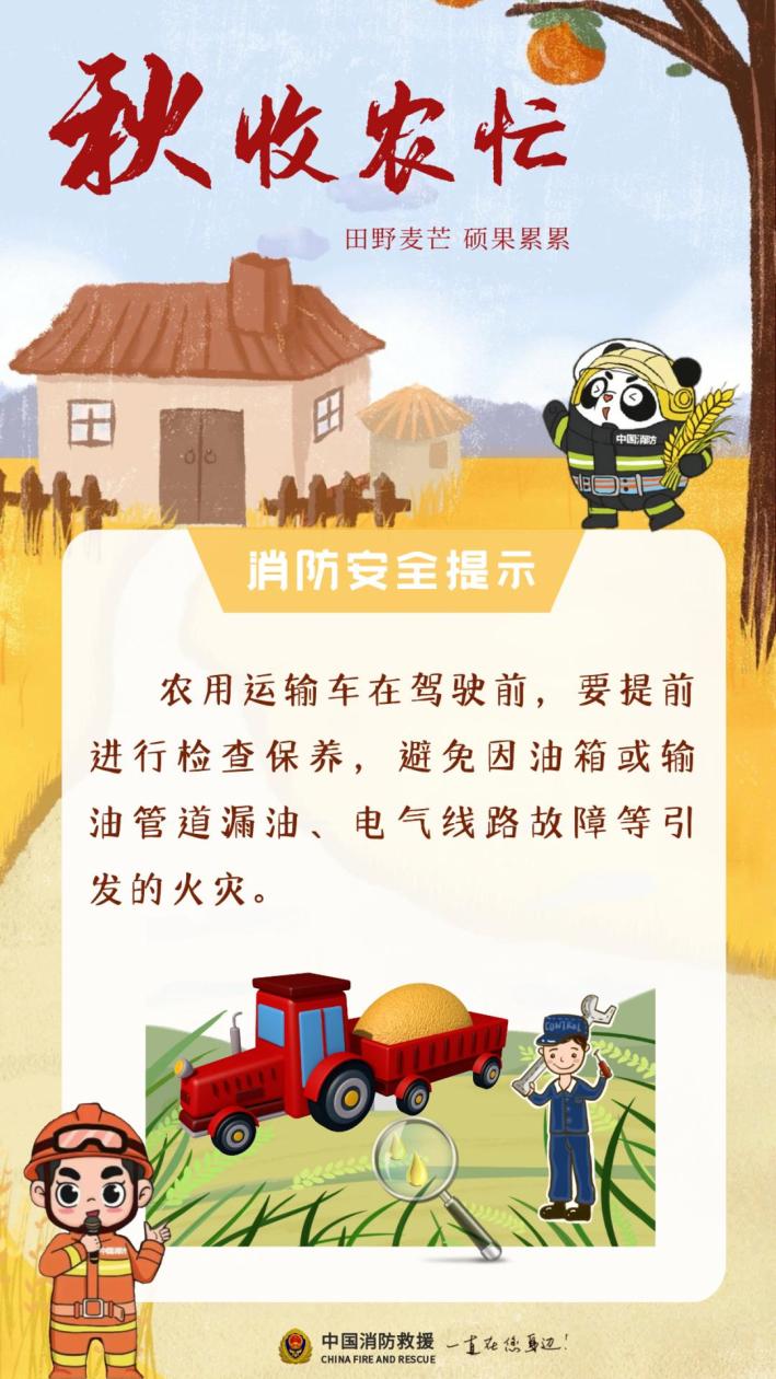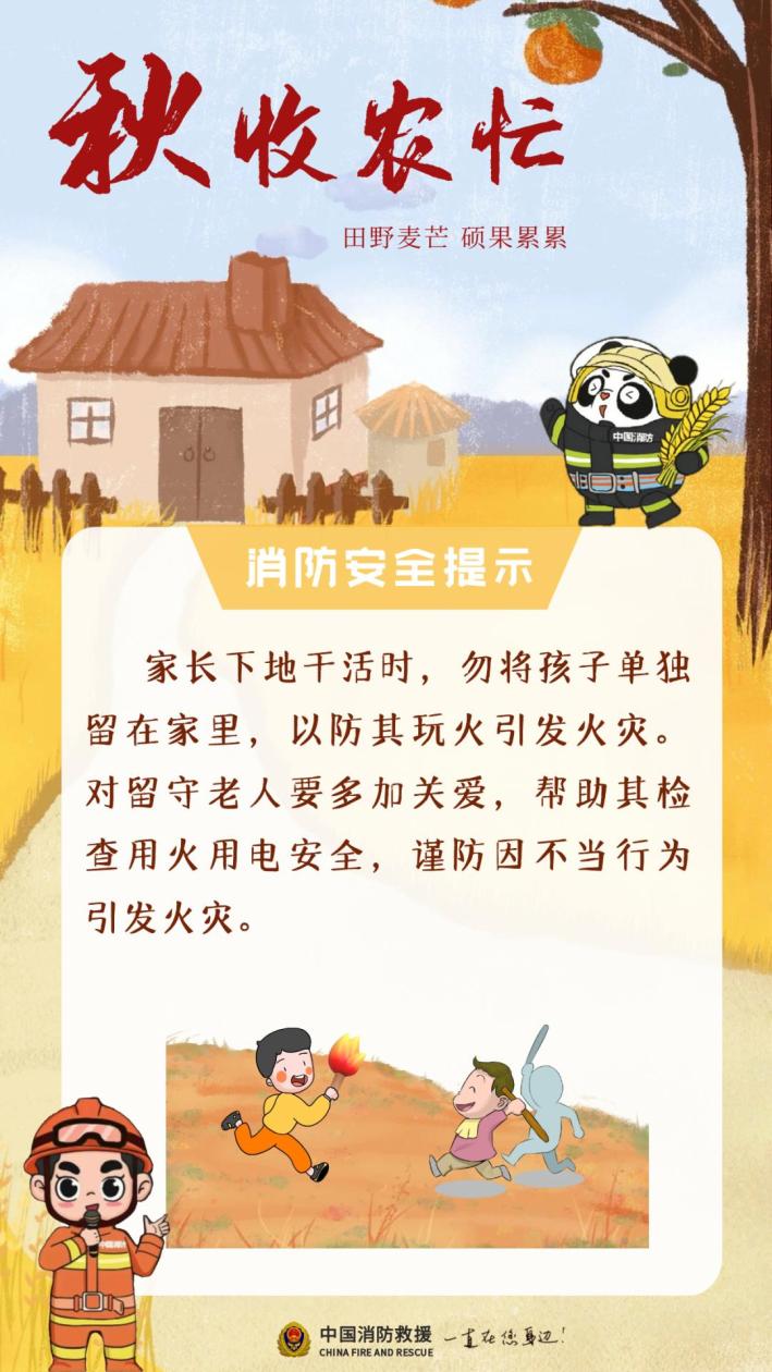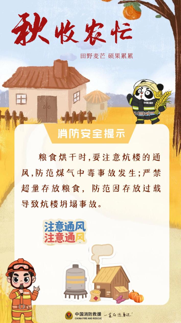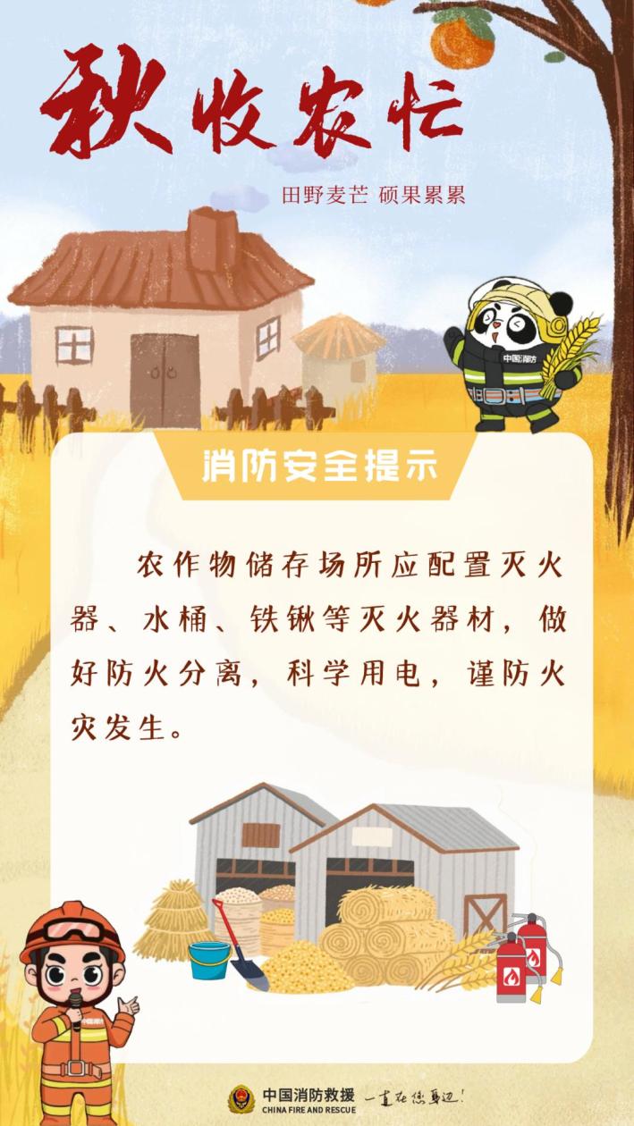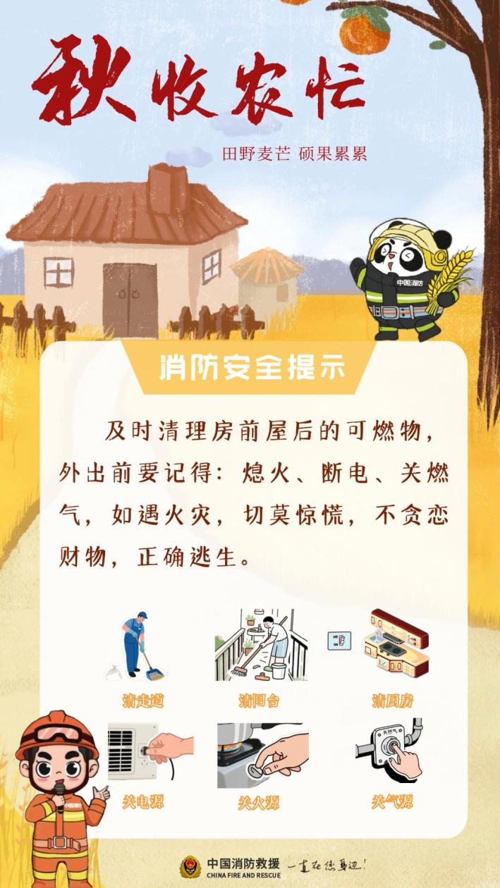 阿消提示,昼夜转换,凉意渐浓,金秋丰收季节已经来临。消防安全是确保丰收成果的重要保障,以下消防安全提示要牢记。