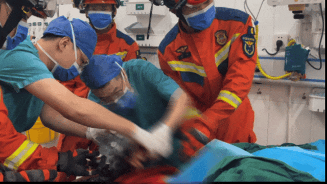 根据现场情况,消防员与医生紧密配合,将伤者转至四楼手术室。医生先对伤者的生命体征进行检查,并对手部被卡位置进行局部麻醉。