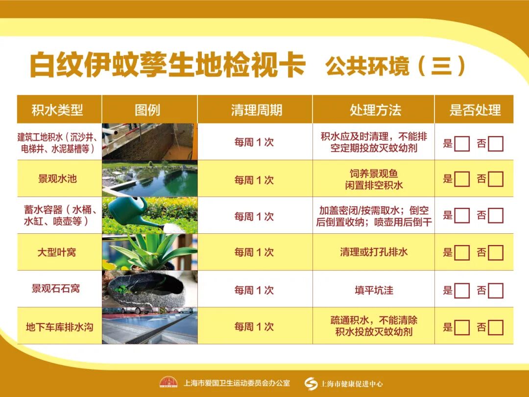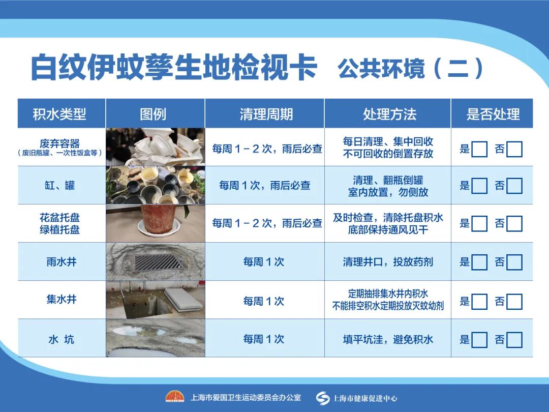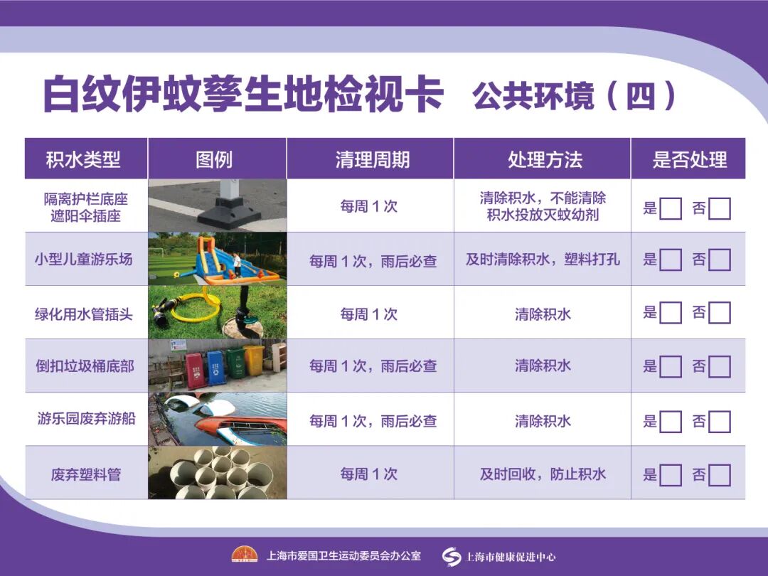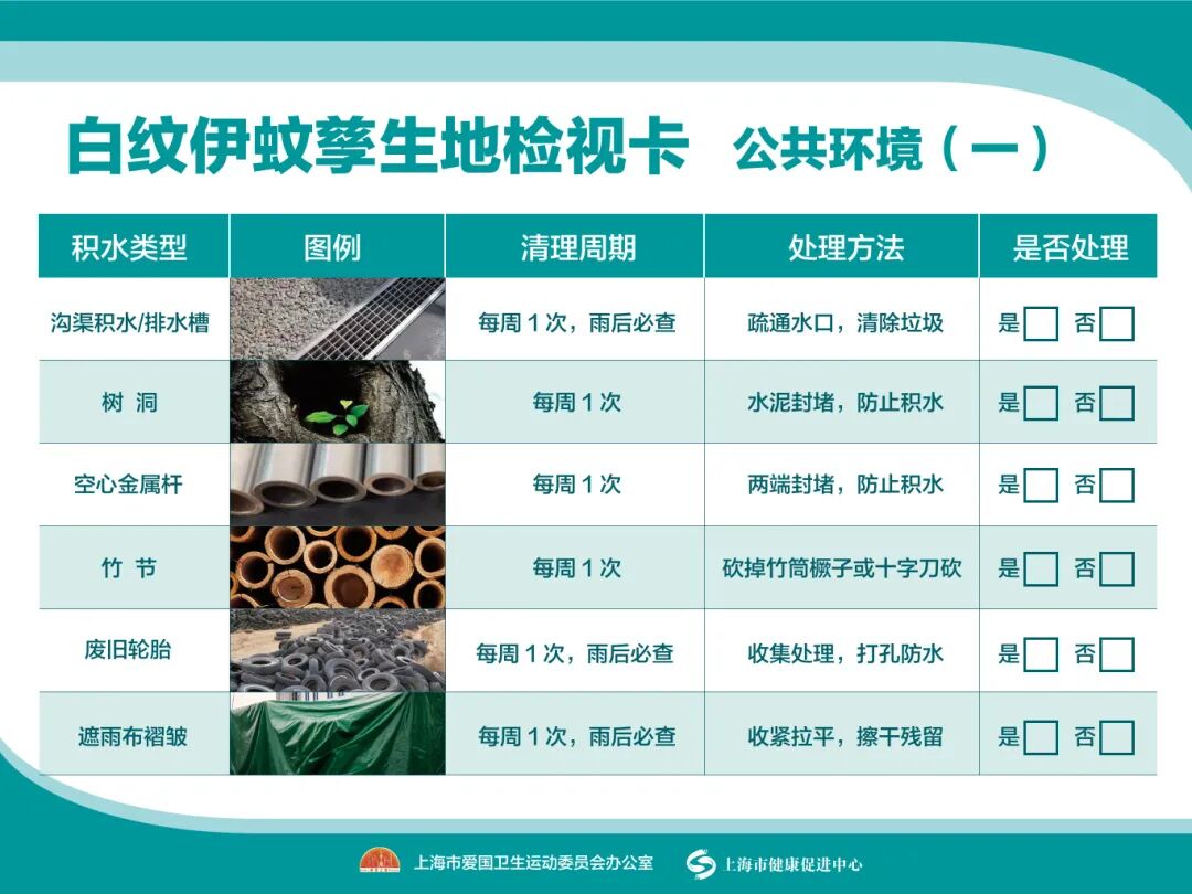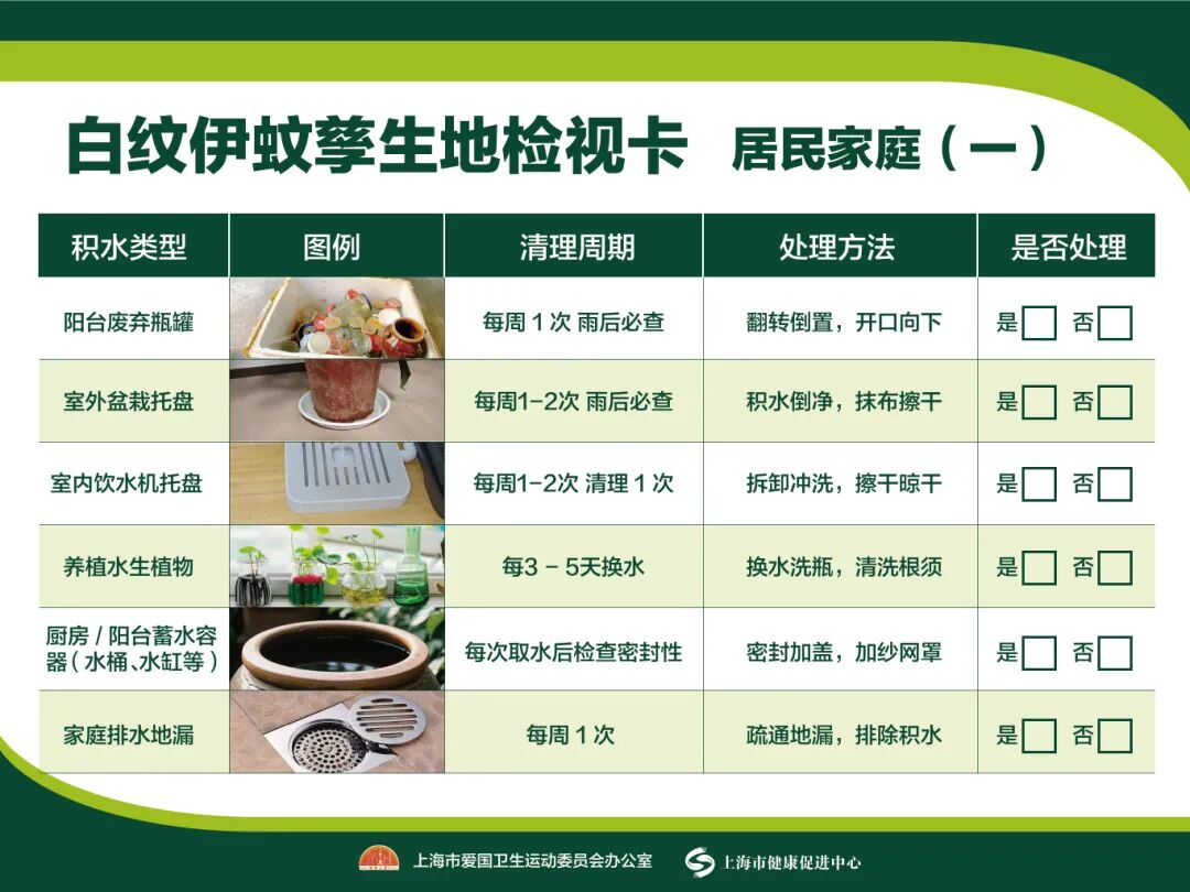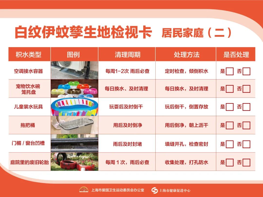 据气象部门预测,近期本市阵雨或雷阵雨频繁,容易形成各种积水环境。为此,市爱卫办、市健康促进中心特别制作了一套六张的《白纹伊蚊孳生地检视卡》,它涵盖了居民家庭和各类社区、单位公共场所中常见的白纹伊蚊孳生的积水类型及处置办法,旨在清积水、防蚊虫、护家园、保健康!