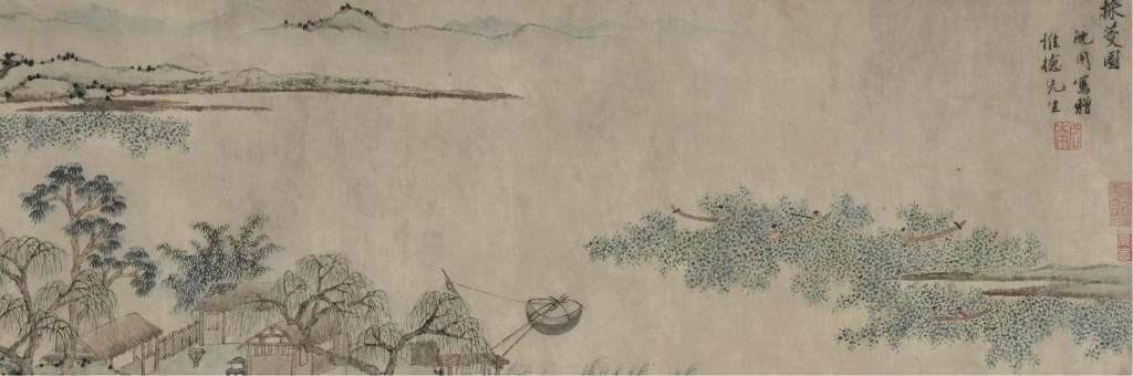 采菱图卷(局部),右侧有小船掩映湖中。 明 沈周 上海博物馆