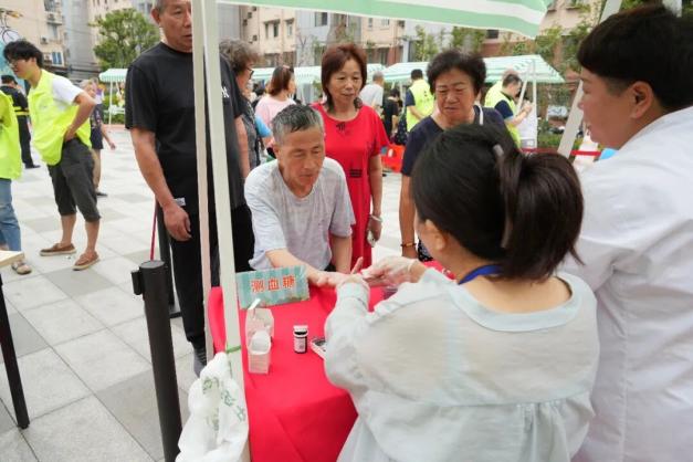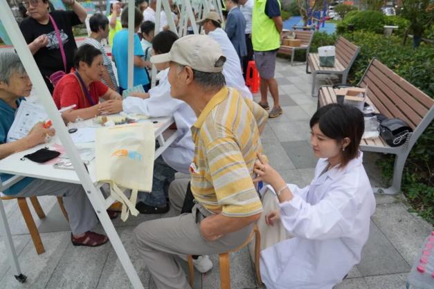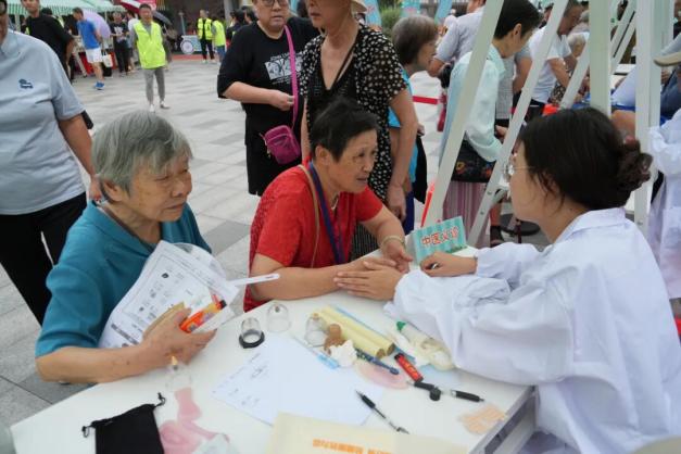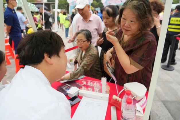 健康咨询区,医护人员为居民免费测血压、血糖;中医师搭脉问诊并叮嘱注意事项;口腔医院医生演示刷牙方式、定制种牙方案;长护险咨询台工作人员为老年居民讲解政策。